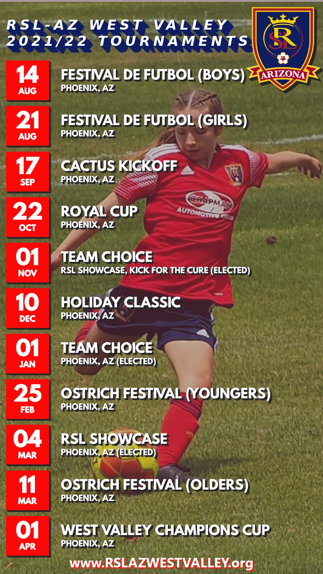 Rsl Az Holiday Classic 2022 Schedule. The tournament is held each March to coincide with the city of Chandlers Ostrich Festival which draws over 250000 visitors. A team that went 30-3 overall last season is looking to make their own name out West and. SIGN UP FOR THE FASTEST GROWING RECREATIONAL PROGRAM IN TOWN.